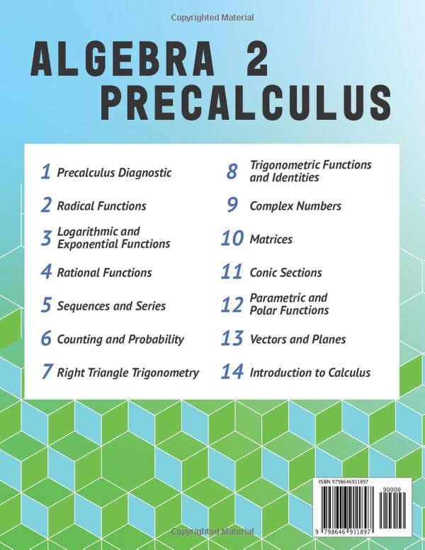 Master your challenging Algebra 2/Precalculus Class with this book! With over 800 practice problems, including 50 full-length practice tests, this book will prepare you for the most difficult problems that may appear on test day. With each chapter, there are around 30 to 40 example exercises that are fully solved in order to provide with you essential skills and strategies. All other practice tests have answer keys provided. Written by a student, for a student, this book will help students master Algebra 2 and Precalculus. Topics Covered: Precalculus Diagnostic, Radical and Rational Functions, Exponential and Logarithmic Functions, Sequences and Series, Counting and Probability, Analytical Trigonometry, Complex Numbers, Vectors and Matrices, Conic Sections, Polar and Parametric Equations, Introduction to Calculus