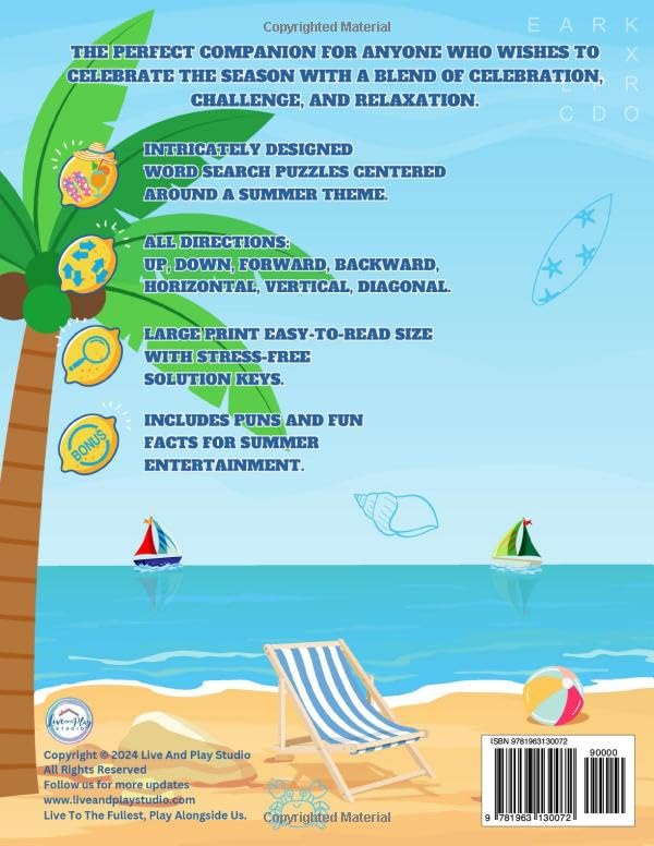 Don’t let summer slip away! Transform those long days into unforgettable memories with exciting educational activities. Boost your brain cognitive and enhance your vocabulary with over 2800 summer-theme words. DESCRIPTION Prepare for a delightful summer break, whether you’re headed to the beach, mountains, an island, a cruise, or simply relaxing by the pool or backyard. This word search book is the perfect way to keep your mind engaged, stimulated, and free from technology all summer long. Experience your language skills and cognitive memory boost with puzzles filled with entertaining puns and intriguing fun facts. Ideal for all ages, from children to seniors–it’s a fun way to keep your mind sharp throughout the summer. Over 2800 words to search. 100 mixed-level puzzles with a summer theme. Large 24 x 24 puzzle grids. Durable 8.5 x 11-inch glossy cover. Easy-to-read 18 pt. large print font. 141 pages filled with puns and fun facts to enhance relaxation. Puzzles span all directions to increase the challenge. FEATURES Enjoy a variety of summer holidays and festive themes, including: Ambiance Animals Astronomy and Constellation Camping Celebrity Birthdays Color Palettes Emotions Environmental Awareness Events & Activities Foods & Drinks Health & Wellbeing Marine Life Movies & TV Shows Nature & Weather Phenomena Outfits & Accessories Plants Road Trips Seasonal Motivation Summer in other languages Summer Holidays Summer Scents Trees Vacation Spots Vegetables And more