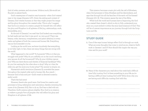 An interactive, yearlong journey through the entire Bible for men–Part of the USA Today bestselling series with the original The Bible in 52 Weeks! Applying the wisdom of the Bible to your life is an integral part of being a Christian man, but it’s not always easy to find the time for Bible study. The Bible in 52 Weeks for Men gives you a clear path to connect with the Lord, guiding you as you read the Bible every day for one year. It’s an easy reading plan that takes you through Scripture week by week, with included lessons and questions designed to help you strengthen your faith and live by His word. A full year of readings–Learn from every chapter of the Bible with a weekly format that only requires about fifteen minutes of reading each day and only one study session each week. Practical prompts–Contemplate God’s teachings with journal entries and exercises that reflect on topics like relationships, family, work, and health. Space for group discussion–Build your fellowship with other Christian men and use this book to hold group study sessions so you can share God’s wisdom with friends and family. Study with the bestselling series–Give the gift of deeper faith to everyone in your life with the companion books: The Bible in 52 Weeks for Families, and the mega-popular, USA Today bestseller The Bible in 52 Weeks for women. Get ready to get closer to God with exercises and reading guides that walk you through each part of the Scripture, one day at a time.