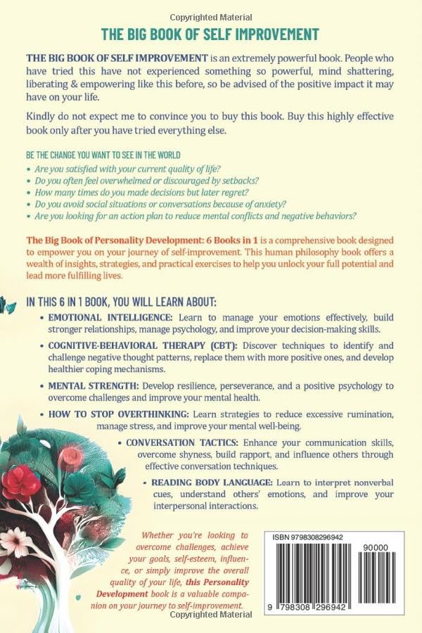 ATTENTION: If ‘Self Improvement’ is not Your No. 1 Priority, this book is not for You. THE BIG BOOK OF SELF IMPROVEMENT is an extremely powerful book. People who have tried this have not experienced something so powerful, mind shattering, liberating & empowering like this before, so be advised of the positive impact it may have on your life. Kindly do not expect me to convince you to buy this book. Buy this highly effective book only after you have tried everything else. FREE BONUS: Get a 50-page personal development worksheet as a free bonus in the book. * BE THE CHANGE YOU WANT TO SEE IN THE WORLD * Are you satisfied with your current quality of life? Do you often feel overwhelmed or discouraged by setbacks? How many times do you made decisions but later regret? Do you avoid social situations or conversations because of anxiety? Are you looking for an action plan to reduce mental conflicts and negative behaviors? The Big Book of Self Improvement: 6 Books in 1 is a comprehensive book designed to empower you on your journey of personal development. This human philosophy book offers a wealth of insights, strategies, and practical exercises to help you unlock your full potential and lead more fulfilling lives. In this 6 in 1 book, you will learn about: EMOTIONAL INTELLIGENCE: Learn to manage your emotions effectively, build stronger relationships, manage psychology, and improve your decision-making skills. COGNITIVE-BEHAVIORAL THERAPY (CBT): Discover techniques to identify and challenge negative thought patterns, replace them with more positive ones, and develop healthier coping mechanisms. MENTAL STRENGTH: Develop resilience, perseverance, and a positive psychology to overcome challenges and improve your mental health. HOW TO STOP OVERTHINKING: Learn strategies to reduce excessive rumination, manage stress, and improve your mental well-being. CONVERSATION TACTICS: Enhance your communication skills, overcome shyness, build rapport, and influence others through effective conversation techniques. READING BODY LANGUAGE: Learn to interpret nonverbal cues, understand others’ emotions, and improve your interpersonal interactions. Whether you’re looking to overcome challenges, achieve your goals, self-esteem, influence, or simply improve the overall quality of your life, this Personality Development book is a valuable companion on your journey to self-improvement. Order this must-read book for personal growth and transform your life today