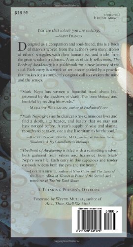Philosopher-poet and cancer survivor, Mark Nepo opens a new season of freedom and joy–an escape from deadening, asleep-at-the wheel sameness–that is both profound and clarifying. His spiritual daybook is a summons to reclaim aliveness, liberate the self, take each day one at a time, and to savor the beauty offered by life’s unfolding. Reading his poetic prose is like being given second sight, exposing the reader to life’s multiple dimensions, each one drawn with awe and affection. The Book of Awakening is the result of his journey of the soul and will inspire others to embark on their own. Nepo speaks of spirit and friendship, urging readers to stay vital and in love with this life, no matter the hardships. Encompassing many traditions and voices, Nepo’s words offer insight on pain, wonder, and love. Each entry is accompanied by an exercise that will surprise and delight the reader in its mind-waking ability.
