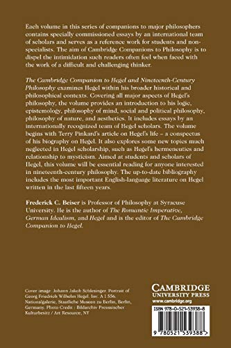 The Cambridge Companion to Hegel and Nineteenth-Century Philosophy examines Hegel within his broader historical and philosophical contexts. Covering all major aspects of Hegel’s philosophy, the volume provides an introduction to his logic, epistemology, philosophy of mind, social and political philosophy, philosophy of nature and aesthetics. It includes essays by an internationally recognized team of Hegel scholars. The volume begins with Terry Pinkard’s article on Hegel’s life, a conspectus of his biography on Hegel. It also explores some new topics much neglected in Hegel scholarship: such as Hegel’s hermeneutics and relationship to mysticism. Aimed at students and scholars of Hegel, this volume will be essential reading for anyone interested in nineteenth-century philosophy. The up-to-date bibliography includes the most important English-language literature on Hegel written in the last fifteen years.