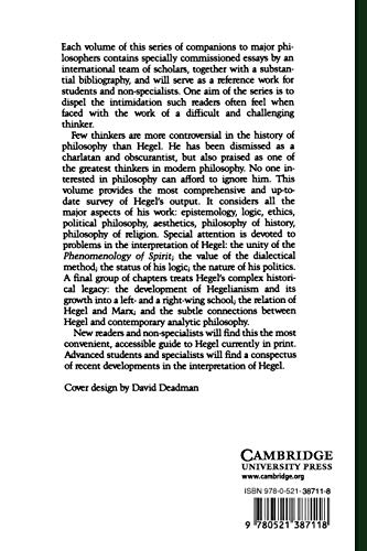 Few thinkers are more controversial in the history of philosophy than Hegel. He has been dismissed as a charlatan and obscurantist, but also praised as one of the greatest thinkers in modern philosophy. No one interested in philosophy can afford to ignore him. This volume considers all the major aspects of Hegel’s work: epistemology, logic, ethics, political philosophy, aesthetics, philosophy of history, philosophy of religion. Special attention is devoted to problems in the interpretation of Hegel: the unity of the Phenomenology of Spirit; the value of the dialectical method; the status of his logic; the nature of his politics. A final group of chapters treats Hegel’s complex historical legacy: the development of Hegelianism and its growth into a left and right wing school; the relation of Hegel and Marx; and the subtle connections between Hegel and contemporary analytic philosophy.