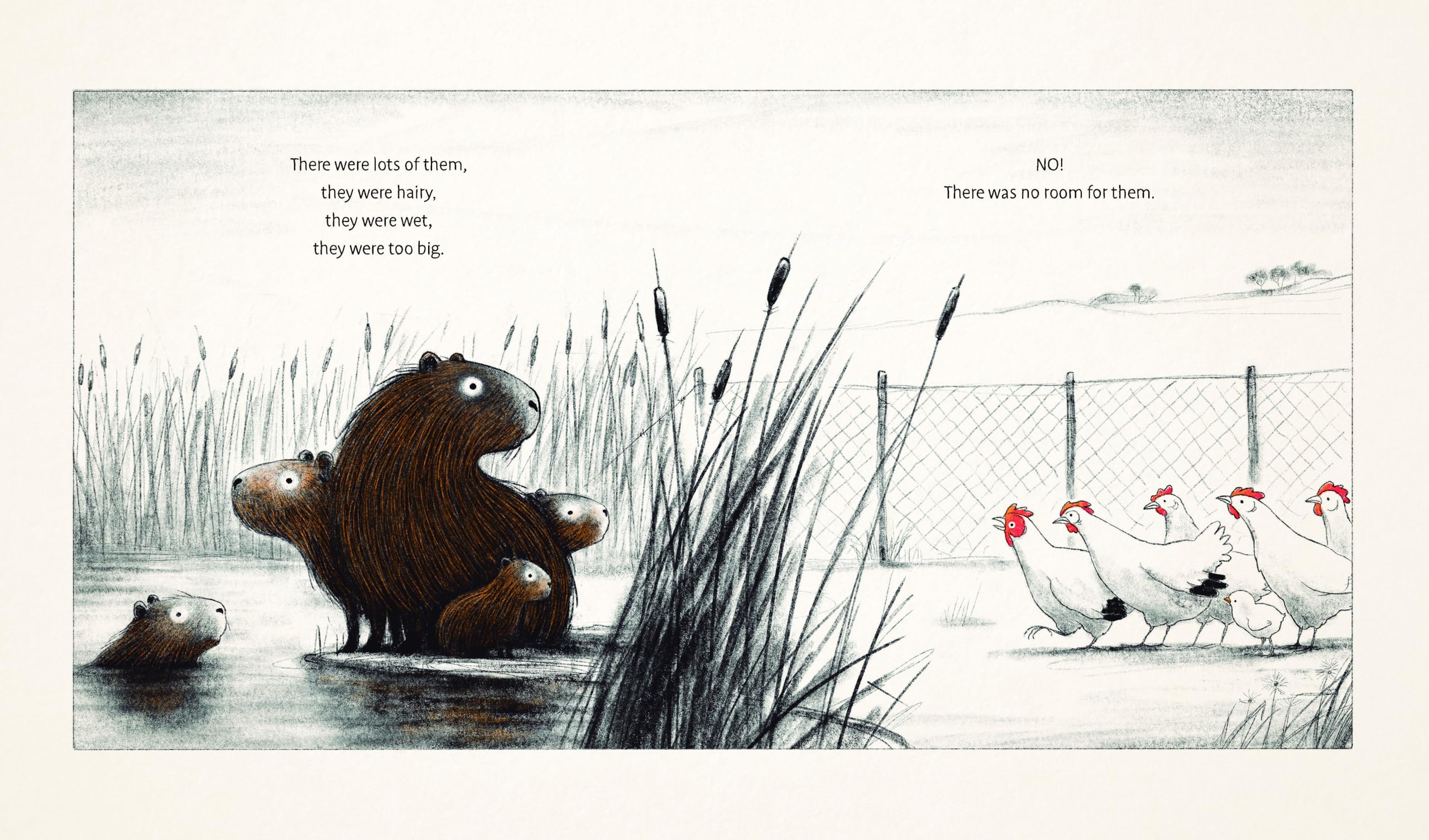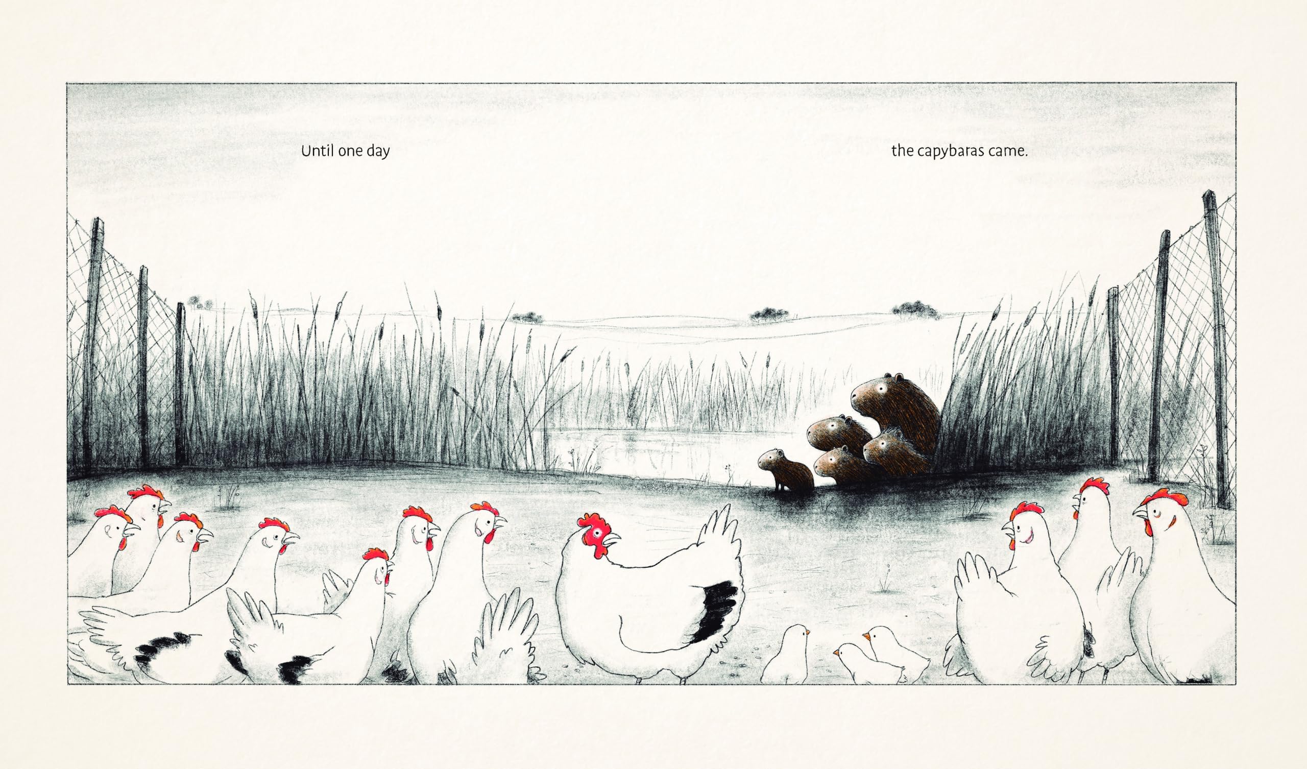 Named a Best Book of the Year by Kirkus and the New York Public Library “Purely exquisite.”–Kirkus (Starred) For kids ages 4-8, a charming and hilarious tale about capybaras: the beloved animal sensation capturing children’s hearts! Hens and their chicks love their warm, snug home. Life is simple and comfortable in the chicken coop, where everyone knows their place and worries are far away. Until one day, when the capybaras appear. To the hens, the capybaras are too big, too wet, and too hairy. They don’t even follow the rules! But it’s hunting season, and the capybaras need somewhere safe to hide. Can the hens learn to get along with their unexpected guests? This delightful story shares the importance of opening our hearts to each other, no matter our differences, and the marvelous surprises that can happen along the way. An Aldana Libros Book, Greystone Kids