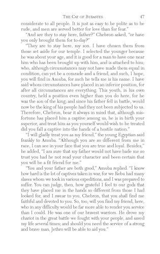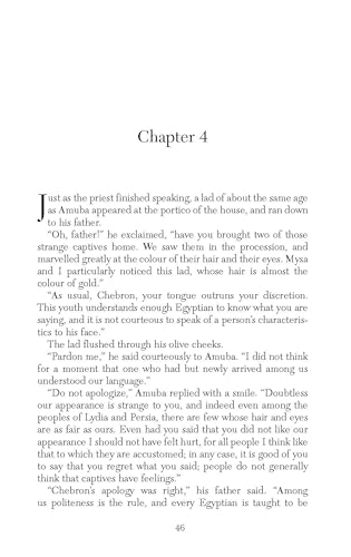 A captivating book that accurately describes life in a magnificent civilization of old, this volume will especially appeal to young readers fascinated by the life and customs of ancient Egypt. Chebron, the young son of an Egyptian high priest, and Amuba, a young slave in the boy’s household, are close friends, but their lives are greatly altered when Chebron accidentally kills a cat, an animal held sacred by the ancient Egyptians. Forced to flee for their safety, the boys and their companions begin a long and dangerous journey. A thrilling adventure story, this is a must-read tale packed with rich, historical information.Young readers will learn about ancient Egyptian religion and geography, how the Nile was used for irrigation, and how the Egyptians made war and were prepared for burial. A captivating book that immerses one into life in a magnificent civilization of old. For young readers fascinated by the life and customs of Ancient Egypt. A thrilling adventure story packed with rich, historical information. Highlights the friendship of a young priest and slave. Young readers will learn about ancient Egyptian religion and geography, how the Nile was used for irrigation, burial rituals, etc. An excellent resource for homeschooling and classroom use.