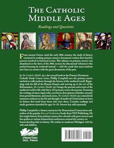 In The Catholic Middle Ages, the second book in the Primary Document Catholic Study Course series, Phillip Campbell uses the primary source method to walk students through the history of the medieval world. Beginning with the fall of the Roman Empire and moving up to the eve of the Reformation, The Catholic Middle Ages brings the persons and events of the medieval world to life with thirty-five primary source documents. Featuring the writings of saints, legal codes, eyewitness descriptions of battles, excerpt from period literature, and much more, The Catholic Middle Ages sourcebook immerses student in the life and thought of medieval Christendom to learn its history first hand from those who were there. Contains readings and study questions intended for ages 14-18. Answer key sold separately.