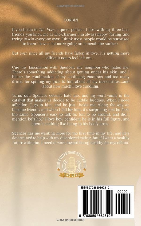 Corbin If you listen to The Vers, a queer podcast I host with my three best friends, you know me as The Charmer. I’m always happy, flirting, and trying to win everyone over. I think most people would be surprised to learn I have a lot more going on beneath the surface. But ever since all my friends have fallen in love, it’s getting more difficult not to feel left out… Cue my fascination with Spencer, my neighbor who hates me. There’s something addicting about getting under his skin, and I blame the combination of my confusing emotions and too many drinks for spilling my guts to him about all my insecurities…and about how much I love cuddling. Turns out, Spencer doesn’t hate me, and my word vomit is the catalyst that makes us decide to be cuddle buddies. When I need affection, I go to him, and he just…holds me. Along the way we become friends, and when I fall for him, it’s surprising that he feels the same. Spencer’s easy to talk to, fun to be around, and did I mention he’s hot? I love how confident he is in his full figure, and there’s nothing like being in his beefy arms. Spencer has me wanting more for the first time in my life, and he’s determined to help with my disordered eating, but if I want a healthy future with him, I need to work toward being healthy for myself too. The Charmer is an opposites-attract romance with a body-positive MC and a cuddle fiend learning to love himself. *The Charmer deals with disordered eating, low self-esteem, and negative talk about weight. While the story is uplifting and none of these are heavy-handed, please see the content warning at the beginning of the book for a full list.