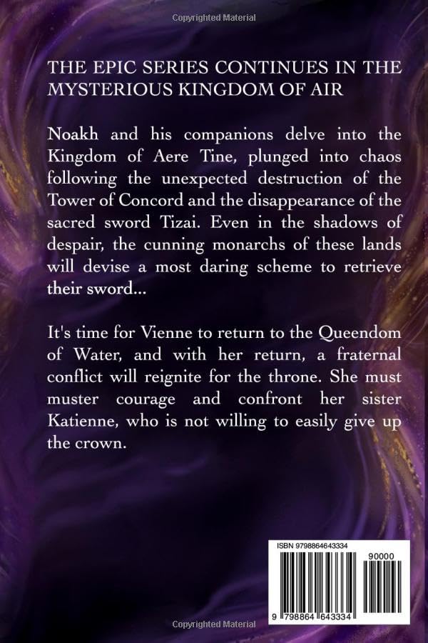 The epic young adult fantasy series continues in the unknown Kingdom of Air. Noakh and his companions delve into the realm of Aere Tine, plunged into chaos following the unexpected destruction of the Tower of Concord and the disappearance of the sacred sword Tizai. Even in the shadows of despair, the cunning monarchs of these lands will concoct a most audacious scheme to reclaim it… It’s time for Vienne to return to the Queendom of Water and with her return, a fraternal conflict will reignite for the throne. She must gather courage and confront her sister Katienne, who is not willing to give up the crown so easily…