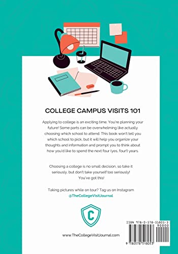 The College Visit Journal: Campus Visits Demystified is everything you need to get the most out of your college visit. In this journal, you will take notes, rank emotion, environment, academics, and student life, and keep track of your thoughts and takeaways from each college visit. It’s a great resource for note-taking for both in-person and virtual visits. Have you ever been on a college tour and were unsure of what questions to ask? The college tour and information session are full of great information, but keeping everything organized from each campus can be a challenge. This book will provide you with thoughtful questions to ask while on campus and is a great resource. Additionally, how are you using your collected information to weigh the considerations of each campus? The book features: Create-your-own table of contents Space for your academic profile (handy when meeting with college advisors or admission counselors) Reference section with key terms, plus reference websites for financial aid and college prep support Writing samples to use when emailing college coaches, professors, and admission counselors Eight sections for eights visits to note what you’re seeing, hearing, feeling and whom you meet on campus. You need this book if you are: The parent of a high school sophomore, junior or senior who is interested in going to college A student interested in finding the best campus fit for four years of college A high school counselor supporting students and families throughout the college admission process A person who believes in college readiness resources The College Visit Journal: Campus Visits Demystified is a thought-provoking book that connects with people from all walks of life and is a great addition to any existing college prep books you may have! My inclusive approach encourages students to use all five senses on their campus visit, as well as, leverage their soft skills to determine which college is the best fit. Now available in Spanish! El diario de visitas universitarias: desmitificando las visitas universitarias (The College Visit Journal: Campus Visits Demystified) (Spanish Edition)