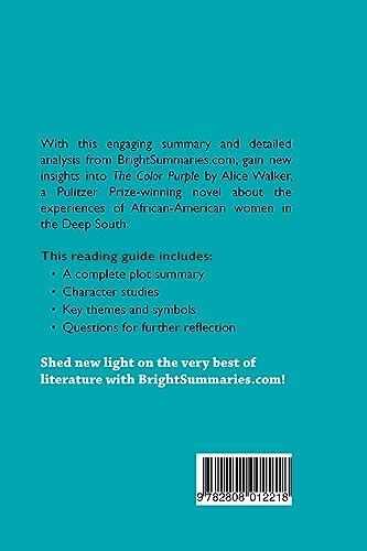 Unlock the more straightforward side of The Color Purple with this concise and insightful summary and analysis! This engaging summary presents an analysis of The Color Purple by Alice Walker, which tells the story of Celie, a poor, uneducated African-American woman living in the rural Georgia in the first half of the 20th century. After being abused by the man she calls her father, married against her will to a man she does not love and forcibly separated from her beloved sister Nettie, Celie begins to despair of her condition. However, thanks in large part to her burgeoning relationship with the charismatic jazz singer Shug Avery, she gradually develops a sense of identity and begins to assert her independence in spite of the barriers facing her. The novel won the 1983 Pulitzer Prize for Fiction and was subsequently adapted into an Oscar-nominated film directed by Steven Spielberg. Find out everything you need to know about The Color Purple in a fraction of the time! This in-depth and informative reading guide brings you: * A complete plot summary * Character studies * Key themes and symbols * Questions for further reflection Why choose BrightSummaries.com? Available in print and digital format, our publications are designed to accompany you on your reading journey. The clear and concise style makes for easy understanding, providing the perfect opportunity to improve your literary knowledge in no time. See the very best of literature in a whole new light with BrightSummaries.com!