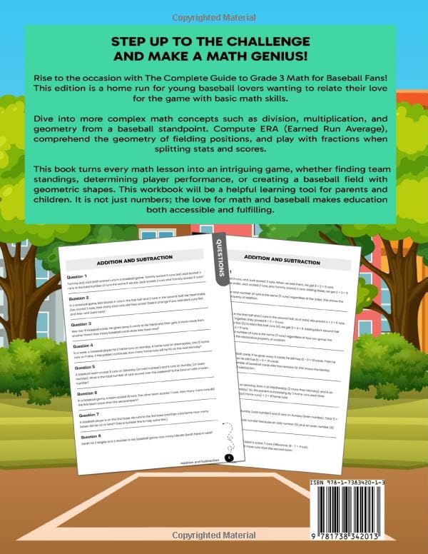 Hit a Grand Slam with Grade 3 Math! Major League Learning scores big with “The Complete Guide to Grade 3 Math for Baseball Fans.” Designed for young learners aged 7-10, this action-packed workbook blends the thrill of baseball with the essential skills of Grade 3 math, making learning fun and effective. Cover All Bases of Grade 3 Math: From the fundamentals of Addition and Subtraction to the complexities of Multiplication and Division, and the strategic thinking required for Fractions and Geometry, this book covers it all. Topics also include Three-Digit Numbers, Modeling Multiplication and Division, Measuring Length, Mass, Capacity, and Time, as well as exploring Perimeter, Area, and Data Statistics. Every concept is presented with a sporty twist that connects baseball directly to key math skills. Comprehensive Practice with 300 Questions: Step up to the plate with 300 carefully crafted questions–20 for each math topic covered. Each question aims to strengthen understanding and build confidence, with detailed answers provided to explain the reasoning behind each solution. This ensures comprehensive coverage and mastery of each skill, making math practice as engaging as a high-stakes game. Perfect Pitch for Homeschool and Classroom Champions: Whether it’s for homeschooling resources or enhancing classroom learning, this workbook fits perfectly into any educational setting. It offers a unique approach that merges curriculum goals with interactive content, including trivia and games that reinforce learning while keeping it exciting. Engaging and Educational: Dive into a world where calculating stats, measuring bats, and geometry in the field come alive. This workbook uses baseball scenarios to teach critical mathematical concepts, ensuring that concepts not only stick but are understood in a context that kids love and relate to. Quality Driven Content: Authored by educators passionate about both sports and academic excellence, this book meets high educational standards and aligns with the educational curriculum. It’s the perfect tool to keep your child ahead in the game of math. Key Features: Targeted Age Group: Ideal for children aged 7-10, in 3rd grade, or needing extra practice at home. Broad Coverage: Tackles all major Grade 3 math topics with a depth that challenges and engages. 300 Baseball-Themed Questions: Ensures thorough practice with detailed answers for every pitch. Versatile Use: Great for both homeschool parents and classroom teachers. Skill Development: Enhances critical thinking, problem-solving, and a genuine love for math through the exciting theme of baseball. Order Your Copy Today and watch your young learner round the bases of Grade 3 math with confidence and enthusiasm. Swing into math mastery with Major League Learning, where education and baseball are the perfect team!