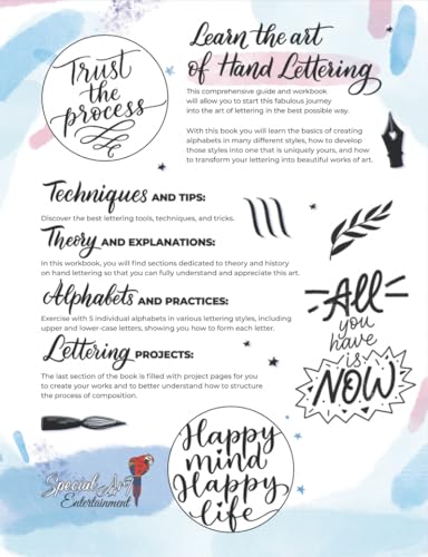 Learn the art of Hand Lettering with this comprehensive guide and workbook, full of knowledge, beauty and inspiration! This Special Art book is the most complete guide to learn the processes behind Hand Lettering easily and accurately. Allow yourself to begin this fabulous journey into the art of lettering in the best possible way. With the help of this book, you will learn the basics of creating alphabets in many different styles. By developing them, you will find your unique style, and learn how to transform your own lettering into beautiful works of art. You will have the opportunity to practice writing letters and words and to create and make your own beautiful masterpieces. We can’t wait to see your results and your fantastic achievements! WHY YOU WILL LOVE THIS BOOK: TECHNIQUES AND TIPS. Discover the best lettering tools, techniques and tricks. THEORY AND EXPLANATION. Unlike many other books, we decided to include some theory and history on hand lettering so that you can fully understand and appreciate this art. ALPHABETS AND PRACTICES. Exercise with 5 individual alphabets in various lettering styles, including upper and lower-case letters, that will teach you how to form each letter, turn those letters into words, and turn those words into works of art. LARGE FORMAT AND QUALITY PAPER. Pages Dimensions 8.5″ x 11.0″ (21.59 cm x 27,94 cm) and good quality 60lb (90gsm) paper stock. LETTERING PROJECTS. The last section of the book is filled with project pages for you to create your own works and to better understand how to structure the process of composition. A SPECIAL GIFT FOR YOU. Included in the book, you will find 2 gifts to practise without limits and to stimulate your creativity for create your own projects. We are sure you will be thrilled! ABOUT SPECIAL ART: Special Art is a leading brand in entertainment, activity and colouring books. We have created a wide range of both Adult and Children’s books, several of which are best-sellers. We always strive for the highest possible quality and value to impress and surprise our readers. Our aim is to bring more colours, joy and happiness into your life by inviting you to immerse yourself in the wonderful world of art and colours. More than 50 books published. Special Art boasts a collection of over 50 entertaining and colouring books. Explore the entire Special Art Book Collection to find your next adventure. Online Community. By purchasing this book, you will gain access to our Facebook group, where you’ll be able to share your designs and see the masterpieces that other community members have created. What are you waiting for? Order your copy of this book now and immerse yourself in the art of hand lettering.