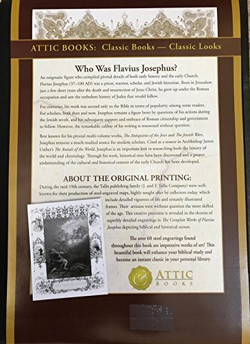 Explore the history of first century Jews from the eyewitness account of Flavius Josephus, legendary Jewish historian. His extra-biblical account offers fascinating historical context to enhance your study of primeval Jewish, Christian, and Roman history. Within this stunning, six book compilation is an invaluable narrative filling in the gaps of otherwise unknown cultural and political details of Israel’s ancient civilization. Flavius Josephus counseled Pharisees on Jewish law from a very early age. His perspective of the Jewish Roman war is truly unique. Josephus scandalously survived the destruction of Jerusalem, became Roman, and was later despised by Jews as a traitor. Yet he is the acclaimed historian of this critical era of Christian history answering questions you didn’t know you needed to ask. This beautifully bound hardcover edition of our earliest history has the look and feel of antiquity. It is an exquisite reproduction of an original, circa – 1850 printing. The thick, crisp, parchment-like paper, vintage font, page layout and drawings offer you the feeling of an authentic rare book in your hands. Could any library be complete without it? The Complete Works of Flavius Josephus, the Jewish Historian as translated by William Whiston includes: Antiquities of the Jews History of the Jewish Wars Sequel to the History of the Jewish Wars Flavius Josephus against Apion The Life of Flavius Josephus Three Dissertations on Jesus Christ, Abraham, John the Baptist, and James the Just The first church historian, Eusebius, calls Flavius Josephus “the most famous Jew of his time.” His writings provide us with prized details that did not survive in any other records. Your study of his exceptional assessment of Israel’s history will bring critical insight to the last two millennia of world events.