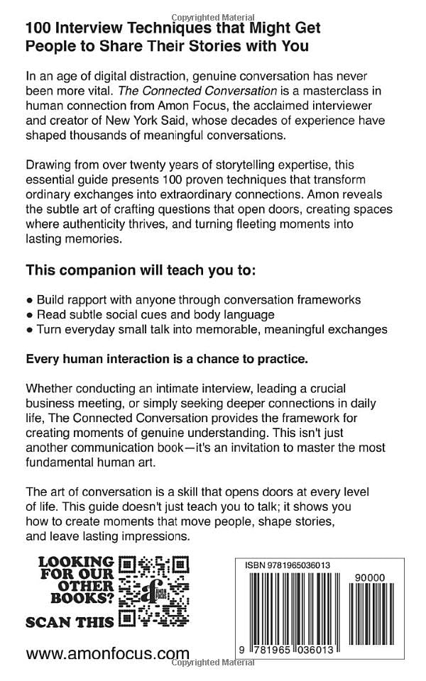From intimate conversations to professional interviews, every human interaction offers an opportunity to connect more deeply. In “The Connected Conversation,” acclaimed interviewer Amon Focus shares 100 actionable techniques drawn from two decades of masterful storytelling and his work on New York Said, where he’s interviewed hundreds of native and notable New Yorkers. This learning companion demystifies the art of meaningful dialogue, whether you’re conducting podcast interviews, preserving family histories, or simply seeking to create deeper connections in daily life. Through practical techniques in active listening, emotional intelligence, and cultural sensitivity, you’ll learn to: Build instant trust and rapport with anyone Navigate difficult conversations with grace Transform casual exchanges into memorable stories Create safe spaces for authentic sharing Developed initially through Amon’s experience with his interview series New York Said, he’s refined these methods through countless interviews with people from all walks of life. The result is a comprehensive guide that’s equal parts practical approach and philosophical exploration. “Every human interaction is a chance to practice.” Whether you’re a journalist, podcaster, educator, or curious mind, this book provides the framework for creating conversations that resonate long after the final word. Perfect for: Content creators seeking to enhance their interview skills Professionals looking to improve client and team interactions Anyone interested in documenting family histories or personal stories Educators teaching communication and storytelling Individuals wanting to build deeper personal connections Join Amon Focus in discovering the art of the connected conversation, and transform how you engage with the world, one talk at a time.