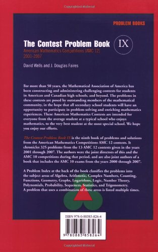 For over fifty years, the Mathematical Association of America (MAA) has been engaged in the construction and administration of challenging contests for students in American and Canadian high schools at every level of ability. This is the ninth book of problems and solutions from the American Mathematics Competitions 12 (AMC), aimed at students of high school age, and featuring 325 problems from the 13 AMC contests held in the years 2001-2007. Graphs and figures have since been redrawn to make them more consistent in form and style, and the solutions to the problems have been both edited and supplemented. The Problem Index contained classifies the problems into the following major subject areas: Algebra and Arithmetic, Sequences and Series, Triangle Geometry, Circle Geometry, Quadrilateral Geometry, Polygon Geometry, Counting Coordinate Geometry, Solid Geometry, Discrete Probability, Statistics, Number Theory, and Logic. These are then broken down into subcategories and cross-referenced for ease of use.