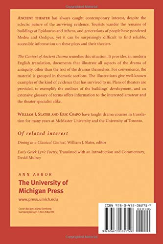 Ancient theater has always caught contemporary interest, despite the eclectic nature of the surviving evidence. Tourists wander the remains of buildings at Epidauros and Athens, and generations of people have pondered Medea and Oedipus, yet it can be surprisingly difficult to find reliable, accessible information on these plays and their theaters. The Context of Ancient Drama remedies this situation. It provides, in modern English translation, documents that illustrate all aspects of the drama of antiquity, other than the text of the dramas themselves. For convenience the material is grouped in thematic sections, such as “music,” or “judging.” The illustrations give well-known examples of the kind of evidence that has survived to us. Plans of theaters are provided, to exemplify the outlines of the buildings’ development, and an extensive glossary of terms offers information to the interested amateur and the theater specialist alike. The Context of Ancient Drama will be of interest to a wide spectrum of students and teachers. Theater historians, students of dramatic performance and the visual arts, and students and teachers in literature-in-translation courses will all find much that speaks to them.