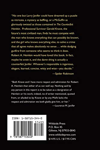 “No one but Larry Janifer could have dreamed up a puzzle as intricate, a mystery as baffling, or a McGuffin as gloriously twisted as those contained in The Counterfeit Heinlein. Professional Survivor Gerald Knave, the future’s most civilized man, finds he must compete with the man who knows everything that can possibly be known, and the girl who knows everything else, to solve a crime that all agree makes absolutely no sense…while dodging gunfire from someone who seems to think it does. Robert A. Heinlein would have loved this book. In fact, maybe he wrote it, and the damn thing is actually a counterfeit Janifer. Whoever’s responsible is ingenious, elegant, learned, concise, witty and wise–you decide.” –Spider Robinson “Both Knave and I have more respect and admiration for Robert A. Heinlein than either of us can well say. Nothing said by any person in this report is to be taken as a denigration of Heinlein or his work; indeed, no sf writer mentioned, quoted from, or alluded to by Knave or by any Misfit lacks the respect and admiration we both gladly give him, or her.” –Laurence M. Janifer