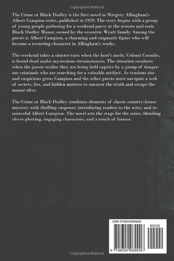 The Crime at Black Dudley is the first novel in Margery Allingham’s Albert Campion series, published in 1929. The story begins with a group of young people gathering for a weekend party at the remote and eerie Black Dudley Manor, owned by the eccentric Wyatt family. Among the guests is Albert Campion, a charming and enigmatic figure who will become a recurring character in Allingham’s works. The weekend takes a sinister turn when the host’s uncle, Colonel Coombe, is found dead under mysterious circumstances. The situation escalates when the guests realize they are being held captive by a group of dangerous criminals who are searching for a valuable artifact. As tensions rise and suspicions grow, Campion and the other guests must navigate a web of secrets, lies, and hidden motives to uncover the truth and escape the manor alive. The Crime at Black Dudley combines elements of classic country-house mystery with thrilling suspense, introducing readers to the witty and resourceful Albert Campion. The novel sets the stage for the series, blending clever plotting, engaging characters, and a touch of humor.