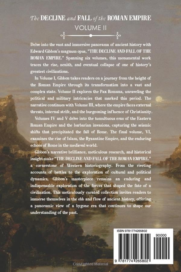Delve into the vast and immersive panorama of ancient history with Edward Gibbon’s magnum opus, “The Decline and Fall of the Roman Empire.” Spanning six volumes, this monumental work traces the rise, zenith, and eventual collapse of one of history’s greatest civilizations. In Volume I, Gibbon takes readers on a journey from the height of the Roman Empire through its transformation into a vast and complex state. Volume II explores the Pax Romana, unraveling the political and military intricacies that marked this period. The narrative continues with Volume III, where the empire faces external threats, internal strife, and the burgeoning influence of Christianity. Volumes IV and V delve into the tumultuous eras of the Eastern Roman Empire and the barbarian invasions, capturing the seismic shifts that precipitated the fall of Rome. The final volume, VI, examines the rise of Islam, the Byzantine Empire, and the enduring echoes of Rome in the medieval world. Gibbon’s narrative brilliance, meticulous research, and historical insight make “The Decline and Fall of the Roman Empire” a cornerstone of Western historiography. From the riveting accounts of battles to the exploration of cultural and political dynamics, Gibbon’s masterpiece remains an enduring and indispensable exploration of the forces that shaped the fate of a civilization. This meticulously curated collection invites readers to immerse themselves in the ebb and flow of ancient history, offering a panoramic view of a bygone era that continues to shape our understanding of the past. The Roman Empire changed the world beyond all recognition. Its reach was all-encompassing, and its effects and influence can be seen everywhere in the modern world. To adequately document the external problems and internal failings that led to its downfall in one volume would be sheer folly. That’s why Edward Gibbon wrote six volumes that have been compiled in one comprehensive work. “The Decline and Fall of the Roman Empire covers the period from 98 to 1590 AD. Due to the absence of comprehensive written sources explaining the reason for the decline, Gibbon faced a Herculean task. Yet as readers familiar with the work will know, he was more than equal to it. Gibbon’s primary thesis is that repeated barbarian invasions led to the Roman Empire’s collapse. He contends that Rome’s citizens turned their back on civic virtue that had once made the “Eternal City” a beacon of civilization for the rest of the world. He maintains the Romans sowed the seeds of their destruction. Gibbon also courted controversy during his lifetime for suggesting that the growth and spread of Christianity also weakened the Roman Empire. Yet in his own words, “instead of inquiring why the Roman Empire was destroyed, we should rather be surprised that it had subsisted for so long.”