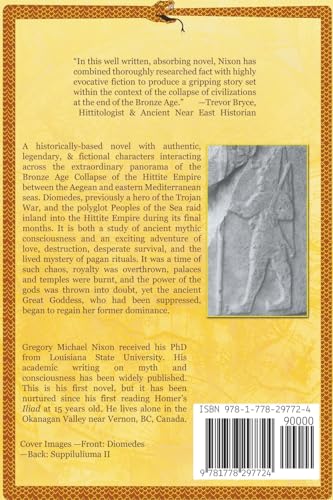 A historically-based novel with authentic, legendary, & fictional characters interacting across the extraordinary panorama of the Bronze Age Collapse in the Hittite Empire between the Aegean and eastern Mediterranean seas. Diomedes, previously a hero of the Trojan War, and the polyglot Peoples of the Sea raid inland into the Hittite Empire during its final months. It is both a study of ancient mythic consciousness and an exciting adventure of love, character, destruction, desperate survival, and the lived mystery of pagan rituals. It was a time of such chaos, royalty was overthrown, palaces and temples were burnt, and the power of the gods was thrown into doubt, yet the ancient Great Goddess, who had been suppressed, began to regain her former dominance. Diomedes, though prominent in Homer’s Iliad — a warrior the equal of Hektor or Achilleus, a thinker as cunning as Odysseus and as wise as Nestor, and the only man who dared wound gods — has seldom, if ever, been the chief protagonist in literature. He is given his due within. His own wandering adventures and suffering after the destruction of Ilios are traced as far north as Kolkhis (Colchis) in the Black Sea, through involvement with the last Hittite royal family in Anatolia, and as far south as Alasiya (Cyprus) in the Mediterranean. He ascends the heights of glory but also must descend into the dark Underworld in the attempt to save the one he loves.