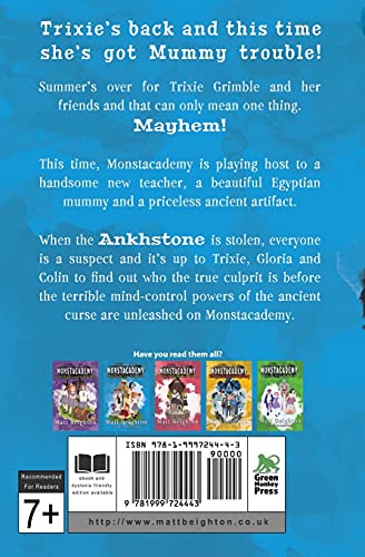 Mystery stories for readers aged 7 – 11 The Second Monstacademy Mystery Trixie’s back and this time she’s got Mummy trouble! Summer’s over for Trixie Grimble and her friends and that can only mean one thing. Mayhem! When the Ankhstone is stolen, everyone is a suspect and it’s up to Trixie, Gloria and Colin to solve yet another mystery at Monstacademy. Can they find out who the true culprit is before the terrible mind-control powers of the ancient curse are unleashed on the school? Can Gloria overcome a new crush in time to help Trixie and Colin wrap up the case? Also available in a dyslexia and visually impaired paperback edition with a larger, more clearly defined font.