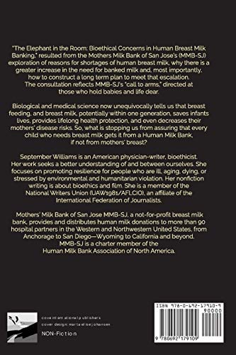 From bioethicist September Williams, MD, the author of ‘Chasing Mercury,’ with Mothers’ Milk Bank, San Jose, comes The Elephant in the Room: Bioethical Concerns in Human Milk Banking. Seriously humorous, informative and timely, The Elephant… makes bioethics look sexy. The year 2018 will be remembered as pivotal in modern history. This year, a first mother-model (in more ways than one ) helped empower all families by breastfeeding her baby at work–on a runway during Fashion Week. How did we come to this point where breastfeeding is sensational? In Dr. Williams’ hands, bioethics, some heady science, and public health are broken into bite sized bits ingestible by ‘everybody and their mothers. She looks at worries about access to breastfeeding and breast milk equity. We are forced to consider why every infant can’t receive breast milk when we know breastfeeding improves the health outcomes for mothers and babies–even in communities most plagued by chronic illnesses.”Should we let babies starve?” The Elephant asks. It is a not so ‘tongue in cheek’ example of a simplified moral question. The book wades through the pain of disproportionate infant mortality by race and maternal morbidity. Evidence is given for why mothers in communities most attacked by high infant mortality and premature births might benefit from mind-body skill strengthening. The ethical traps inherent in dependance on bio-technology and neonatal intensive care units reacting to prematurity–without equal focus on diminishing root causes of the problem–are underlined. The daily morning restocking of breast milk bank freezers, emptied by night to feed frail babies, is a miracle facilitated by donations from womens’ bodies and hearts. The Elephant in the Room: Bioethical Concerns in Human Milk Banking trumpets a song that can be easily heard by a wide range of people–women and men, health care professionals, owners of restaurants, bookstores, movie theaters, and the average persons on the street. The clarion call? “More breast milk, please.” Not for profit Mothers’ Milk Bank, San Jose provides over 1/2 million ounces of milk to babies in need annually. They easily require twice as many donations to adequately meet growing projections. That growth is related to multiple factors both technical, societal and medically based. Short term inability for mothers to nurse their newborns are often expanded by geopolitical and social ambivalence for the needs of families and babies. This book reflects the MMB-SJ “call to arms,” directed at those who hold babies and life dear. Proceeds from The Elephant in the Room: Bioethical Concerns in Human Milk Banking are being donated to Mothers’ Milk Bank San Jose.