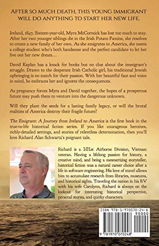 After so much death, this young immigrant will do anything to start her new life. Ireland, 1847. Myra McCormick has lost too much to stay. After the sixteen-year-old’s two younger siblings die in the Irish Potato Famine, she resolves to create a new family of her own. As she emigrates to America, she meets a college student who’s both handsome and the perfect candidate to let her live out her new dream… David Kaplan has a knack for books but no clue about the immigrant’s struggle. Drawn to the desperate Irish Catholic girl, his traditional Jewish upbringing is no match for their passion. With her beautiful face and voice in mind, he embraces her and ignores the consequences. As pregnancy forces Myra and David together, the hopes of a prosperous future may push them to venture into the dangerous unknown. Will they plant the seeds for a lasting family legacy, or will the brutal realities of America destroy their fragile future? The Emigrant is the first book in the true-to-life American Journeys historical fiction series. If you like courageous heroines, richly-detailed settings, and stories of relentless determination, then you’ll love Richard Alan Schwartz’s poignant tale. Buy The Emigrant: A Journey from Ireland to America to embark on an emotional journey today! NOTE: Previously published under the title American Journeys: From Ireland to the Pacific Northwest Book1/i>. Content has not changed. Title change and Author name change (from pen name of Richard Alan to legal name of Richard Alan Schwartz) necessitated a new ISBN number.