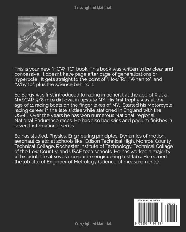 “The Encyclopedia of High Performance Motorcycle Riding Techniques” is the replacement book for My First Book “Introduction of Motorcycle Road Racing” which was originally written for my racing school. While “The Encyclopedia” still contains the same basic core material. Everything from basic racing lines, throttle control, proper gear selection, crash avoidance and trail braking in the turns, just to mention a few, are covered in this book. This incarnation has been expanded to a complete and thorough explanation of all the material necessary to improve lap times and general racing ability. The basic science and dynamics of these techniques are also covered to give a complete overview of each topic. The subjects are covered comprehensively and in detail with abundant use of color diagrams and graphics to make everything as clear and as easy as possible to visualize. The information in this book has been compiled over 50 years of my involvement in motorcycle road racing. It is also the main textbook used in the “Ed Bargy Racing Schools”. The techniques discussed here are based on personal, hands on experience and the well-known, sound, and accepted laws of physics and engineering principles. This book not only covers “How to” but, also delves into “Why and When, the Techniques Work” plus some of the true science behind them.
