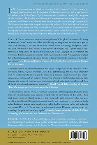 In The Environment and the People in American Cities, Dorceta E. Taylor provides an in-depth examination of the development of urban environments, and urban environmentalism, in the United States. Taylor focuses on the evolution of the city, the emergence of elite reformers, the framing of environmental problems, and the perceptions of and responses to breakdowns in social order, from the seventeenth century through the twentieth. She demonstrates how social inequalities repeatedly informed the adjudication of questions related to health, safety, and land access and use. While many accounts of environmental history begin and end with wildlife and wilderness, Taylor shows that the city offers important clues to understanding the evolution of American environmental activism. Taylor traces the progression of several major thrusts in urban environmental activism, including the alleviation of poverty; sanitary reform and public health; safe, affordable, and adequate housing; parks, playgrounds, and open space; occupational health and safety; consumer protection (food and product safety); and land use and urban planning. At the same time, she presents a historical analysis of the ways race, class, and gender shaped experiences and perceptions of the environment as well as environmental activism and the construction of environmental discourses. Throughout her analysis, Taylor illuminates connections between the social and environmental conflicts of the past and those of the present. She describes the displacement of people of color for the production of natural open space for the white and wealthy, the close proximity between garbage and communities of color in early America, the cozy relationship between middle-class environmentalists and the business community, and the continuous resistance against environmental inequalities on the part of ordinary residents from marginal communities.