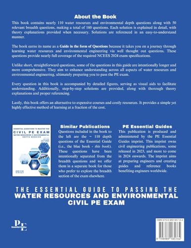 This book contains nearly 110 water resources and environmental depth questions along with 50 relevant breadth questions, making a total of 160 questions. Each solution is explained in detail, with theory explanations provided when necessary. Solutions are referenced in an easy-to-understand manner. The book earns its name as a Guide in the form of Questions because it takes you on a journey through learning water resources and environmental engineering via well thought out questions. These questions provide nearly full coverage of the required NCEES 2024 exam specifications. Unlike short, straightforward questions, some of the questions in this guide are intentionally longer and more comprehensive. They aim to enhance understanding across all aspects of water resources and environmental engineering, ultimately preparing you to pass the PE exam. Every question in this book is accompanied by detailed figures, serving as visual aids to facilitate understanding. Additionally, step-by-step solutions are provided, along with thorough theory explanations and proper referencing. Lastly, this book offers an alternative to expensive courses and costly resources. It provides a simple yet highly effective method of learning at a fraction of the cost. Also, you can find us at www.PEessentialguides.com
