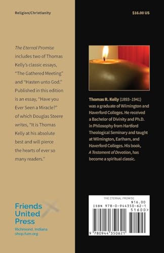 The Eternal Promise: A contemporary Quaker classic and a sequel to A Testament of Devotion by Thomas Kelly with foreword by Howard Macy The Eternal Promise includes two of Thomas Kelly’s classic essays, “The Gathered Meeting” and “Hasten unto God.” Published in this edition is an essay, “Have you Ever Seen a Miracle?” of which Douglas Steere writes, “It is Thomas Kelly at his absolute best and will pierce the hearts of ever so many readers.”
