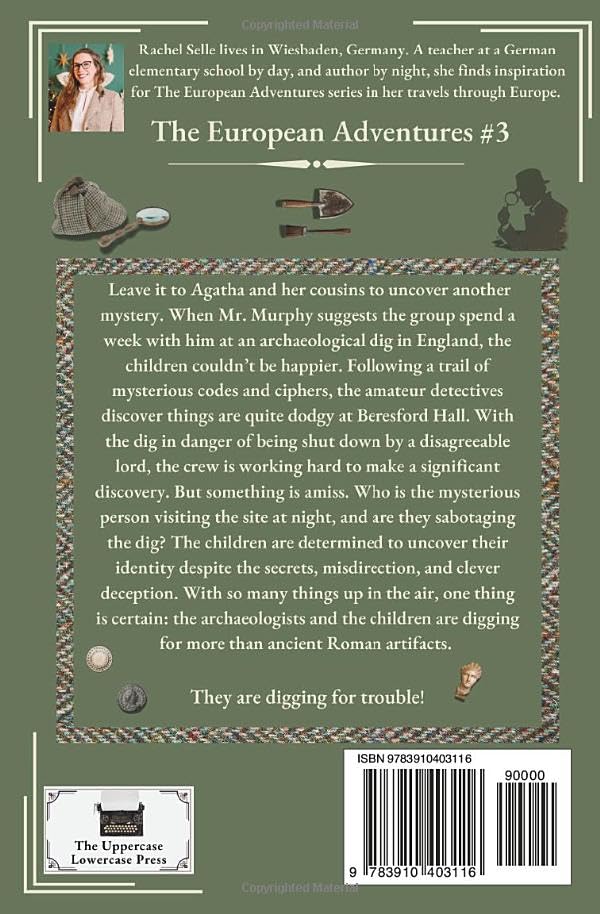 Secret Codes and Ciphers — Ancient Roman Artifacts — So Many Suspects… Dive into another exciting adventure with Agatha Harrington and her cousins as they dig up another mystery! When Mr. Murphy suggests the group spend a week with him at an archaeological dig in England, the children couldn’t be happier. Following a trail of mysterious codes and ciphers, the amateur detectives discover things are quite dodgy at Beresford Hall. With the dig in danger of being shut down by a disagreeable lord, the crew is working hard to make a significant discovery. But something is amiss. Who is the mysterious person visiting the site at night, and are they sabotaging the dig? The children are determined to uncover their identity despite the secrets, misdirection, and clever deception. With so many things up in the air, one thing is certain: the archaeologists and the children are digging for more than ancient Roman artifacts. They are digging for trouble! Each installment of The European Adventures delivers an exciting mystery and is chock-full of history without making you feel like you’re in school. Never shying from a challenge or a chance to help, our amateur detectives explore a country’s culture, history, food, and language. They model integrity, character, and friendship as they chase down clues to find the culprit. The European Adventures series is not just a thrilling read but also a valuable educational resource for public and homeschool programs. It serves as a supplemental reader, reinforcing concepts, engaging students, and supporting their learning process. If you enjoy reading Nancy Drew, The Boxcar Children, A to Z Mysteries, the National Park Mystery Series, and Timmi Tobbson, you’ll love The European Adventures! Shelve under: mystery books for kids 9-12 mystery books for kids 8-10 adventure books for boys adventure books for girls chapter books for kids age 9-12 chapter books for kids age 8-10 books for intermediate readers books for reluctant readers solve riddles, solve puzzles, solve mysteries crack the case like a sleuth children’s chapter books detective books for kids Britain for kids Roman Empire ancient Rome for kids archaeology fiction mystery books archeology fiction mystery books homeschool curriculum Especially for fans of: Nancy Drew Mysteries Gravity Falls Get a Clue A to Z Mysteries Boxcar Children Encyclopedia Brown Hardy Boys Ballpark Mysteries The Magic Treehouse The Babysitters Club I survived Secret Agent 6th Grader The Famous Five