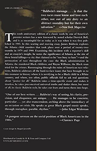 One of America’s most important writers takes on the arrest of Wayne Bertram Williams for the murder of twenty-eight black children in Atlanta to offer this searing indictment of the nation’s racial stagnation. This edition of James Baldwin’s classic work offers a new foreword by Derrick Bell (with Janet Dewart Bell), and is as meaningful today as it was when it was first published in 1985. In his searing and moving essay, James Baldwin explores the Atlanta child murders that took place over a period of twenty-two months in 1979 and 1980. Examining this incident with a reporter’s skill and an essayist’s insight, he notes the significance of Atlanta as the site of these brutal killings–a city that claimed to be “too busy to hate”–and the permeation of race throughout the case: the black administration in Atlanta; the murdered black children; and Wayne Williams, the black man tried for the crimes. Rummaging through the ruins of American race relations, Baldwin addresses all the hard-to-face issues that have brought us a moment in history where it is terrifying to to be a black child in white America, and where, too often, public officials fail to ask real questions about “justice for all.” Baldwin takes a time-specific event and makes it timeless: The Evidence of Things Not Seen offers an incisive look at race in America through a lens at once disturbing and profoundly revealing.