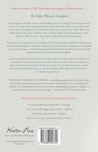 From the author of the beloved, best-selling HENRIETTA AND INSPECTOR HOWARD series, winner of over 80 international awards. “Michelle Cox writes flawed, fascinating women with understanding, compassion, and grace–I rooted for them with every turn of the page!”– Kate Quinn, New York Times best-selling author “Cox offers a powerful saga that plunges into the complexity of family, love, forgiveness, and the cyclical nature of three-generational family dynamics.”–Booklife, Editor’s pick “An addictive read!”–Kirkus Reviews “. . . An emotional tale that grabs you by the throat and carries you through to the exhilarating end.” James Conroyd Martin, author of The Poland Trilogy and Fortune’s Child: A Novel of Empress Theodora When eight-year-old Nora arrives at the Park Ridge School for Girls in 1932, she is sure there’s been some mistake. She can’t imagine why she and her little sister, Patsy, were torn from their mother only to be subjected to the cruel whims of the house matron, Mrs. Morris. When their mother fails to rescue them week after week–and Mrs. Morris drops hints that their mother may be a “fallen woman”–Nora begins to doubt they will ever see her again. Nine years prior, at seventeen, Gertie Gufftason runs off with Lorenzo, the barker for the traveling carnival passing through her small coal-mining town in Southern Iowa. Thinking she is embarking on a fantastic adventure, Gertie is bitterly disappointed by the life that follows and is thrown into despair when the State removes their two daughters. Gertie eventually tracks down her girls at the Park Ridge, but, expecting a warm welcome, she is shocked by Nora’s cool reception. Nora reluctantly returns home with Gertie and Patsy, determined to live a more perfect life than her mother. It is only when she discovers a secret Gertie has kept hidden all these years that Nora begins to fully understand–and forgive–her mother’s tragic choices . . .