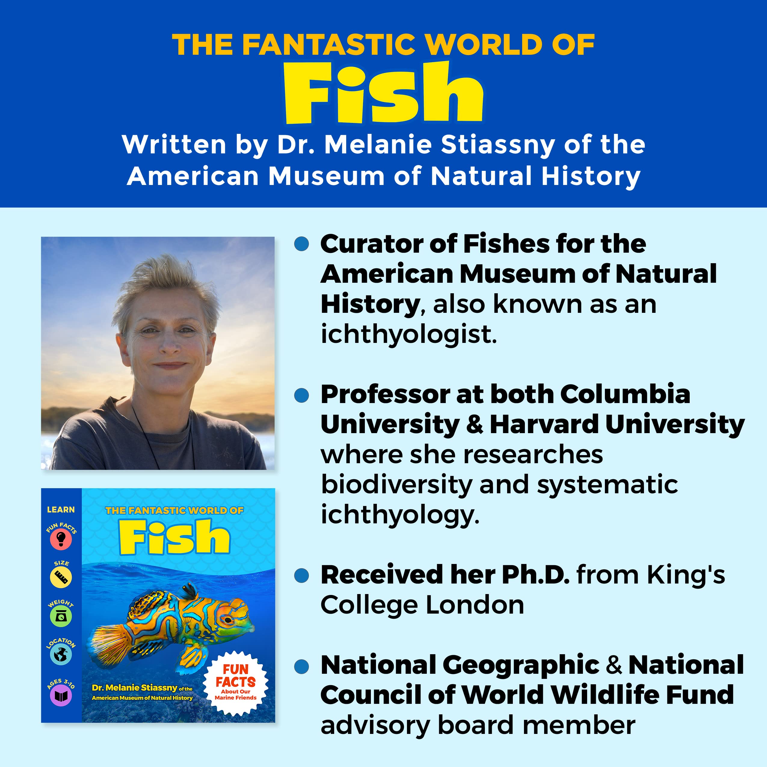 Discover incredible facts about the fish that swim in our great big ocean This book helps children learn to respect and understand the wonders of our beautiful deep blue ocean. Kids will discover unique facts about fishes like the majestic whale shark, spectacular Pacific sailfish, or the big blue whale. Coral reef explorers, get ready to learn all about fish and go under the sea to the greatest educational aquatic life adventure! Written by an Ichthyologist from the American Museum of Natural History Written by Dr. Melanie Stiassny, Curator of Fishes at the American Museum of Natural Museum. This educational book will captivate children with accredited wildlife photography which has proven to help them recognize different kinds of animals. From this book children will learn: Where species of fish live How to identify them Their shapes and sizes Their favorite foods Adorable fun facts And much more! Beautiful fish picture book transports children ages 3-10 into the deepest depths of the ocean This is the ultimate book of fishes that will stay with kids forever and inspire them to become animal lovers, grow an appreciation for ocean creatures, and maybe even set them on a path to become conservationists! Collect the entire 9-book series! The “Fantastic World” series will help your child learn about all the incredible facts about animals in every region of the world. With each book written by a well-known expert in its field, this series is a reliable resource for children to learn and appreciate our planet. We warmly welcome all readers and recommend this informative book to parents, teachers, or anyone with a passion for education and wildlife conservation. Author affiliation is for purposes of identification only. No sponsorship or endorsement of this book by the author’s employer is claimed or implied.