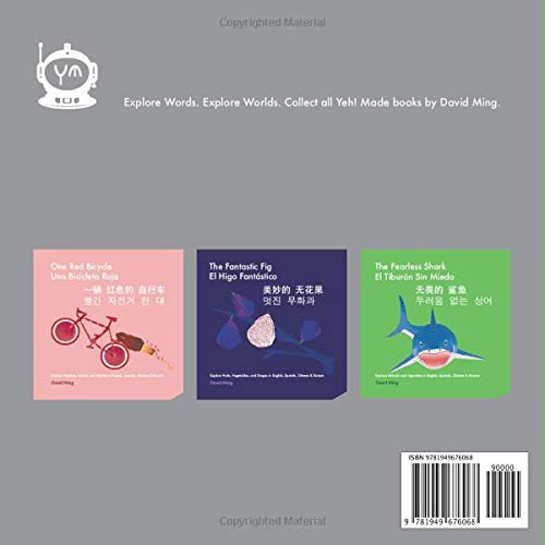 Introduce your kids to Animals and Opposites in English, Spanish, Chinese, and Korean. Great for Young Learners and Pre-K: Have fun reading about a fearless shark compared to a shy condor, a noisy rooster compared to a quiet turtle, and much more. Every page pairs colorful artwork with precise translations in all four languages, including both Traditional and Simplified Chinese characters. Pronunciation Help: Both Mandarin Chinese Pinyin and Korean Romanization are included to help sound out words using the Latin alphabet. Encouraging Global Citizens: Inspired by his own multicultural family, David Ming wrote his multilingual book Series to bring together children, parents, and grandparents across cultures and generations. His hope is for multilingual books to make story time more inclusive and fun for everyone. Whether teaching your children your mother tongue or encouraging bilingual/trilingual flexibility, this book is for you. Yeh! Books. Explore Words. Explore Worlds.