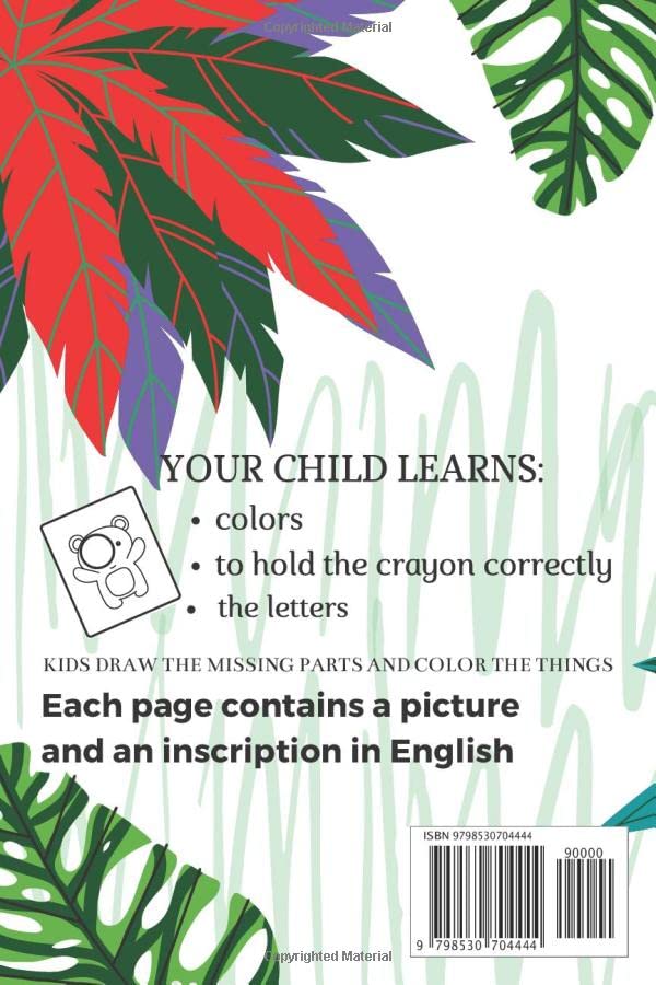 Educational coloring book for toddlers, perfect for children aged 2-5! YOUR CHILD LEARNS: colors, to hold the crayon correctly, the letters. Builds hand-eye coordination and motor coordination. Kids draw the missing parts and color the things. Each page contains a picture and an inscription in English. 6 “x 9” book size perfect for little hands!