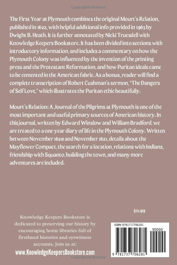 The First Year at Plymouth combines the original Mourt’s Relation, published in 1622, with helpful additional info provided in 1963 by Dwight B. Heath. It is further annotated by Nicki Truesdell with Knowledge Keepers Bookstore. It has been divided into sections with introductory information, and includes a commentary on how the Plymouth Colony was influenced by the invention of the printing press and the Protestant Reformation, as well as how Puritan ideals came to be cemented in the American fabric. As a bonus, reader will find a complete transcription of Robert Cushman’s sermon, “The Dangers of Self Love,” which illustrates the Puritan ethic beautifully. Mourt’s Relation: A Journal of the Pilgrims at Plymouth is one of the most important and useful primary sources of American history. In this journal, written by Edward Winslow and William Bradford, we are treated to a one-year diary of life in the Plymouth Colony. Written between November 1620 and November 1621, details about the Mayflower Compact, the search for a location, relations with Indians, friendship with Squanto, building the town, and many more adventures are included.