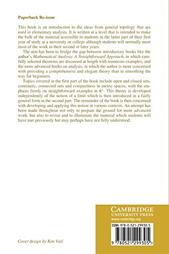 This book is an introduction to the ideas from general topology that are used in elementary analysis. It is written at a level that is intended to make the bulk of the material accessible to students in the latter part of their first year of study at a university or college although students will normally meet most of the work in their second or later years. The aim has been to bridge the gap between introductory books like the author’s Mathematical Analysis: A Straightforward Approach, in which carefully selected theorems are discussed at length with numerous examples, and the more advanced book on analysis, in which the author is more concerned with providing a comprehensive and elegant theory than in smoothing the ways for beginners. An attempt has been made throughout not only to prepare the ground for more advanced work, but also to revise and to illuminate the material which students will have met previously but may have not fully understood.