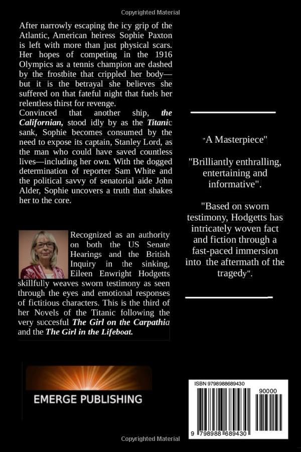 Who was to blame for the sinking of the Titanic? Using sworn testimony from the US Senate hearings into the sinking of the Titanic, this question is examined in detail. Fictional characters intermingle with real characters so that the story takes on a very personal viewpoint and yet the actual witness testimonies remain unaltered, as do the established truths. Titanic passenger American heiress Sophie Paxton once dreamed of achieving Olympic glory with “Dick” Williams. (Fact: “Dick” did go on to win a gold medal at the 1924 Olympics despite almost losing his legs while surviving the wreck). On the other hand, the sinking of the Titanic shattered Sophie’s aspirations. Injuries from that icy night ended her own hopes of competing for an Olympic tennis championship, but they ignited a new fire within her–a burning need for revenge. Discovering from the senate hearings that another ship, the Californian (fact), was close enough to rescue the Titanic’s passengers but chose to ignore their cries for help, Sophie embarks on a relentless quest to expose the truth. With the reluctant assistance of Sam White, a reporter more interested in discovering the secrets of the Jekyll Island banking conspiracy (fact), and John Alder, a determined senatorial aide, Sophie uncovers the identity of the Californian’s captain: Stanley Lord. As she digs deeper, Sophie’s obsession with holding Lord accountable for her shattered life spirals out of control, blinding her to the danger she is bringing upon herself and those she loves. In a race against her own demons, Sophie teeters on the brink of self-destruction. It will take a brave soul to stop her before she destroys everything and everyone in her path. But as her thirst for vengeance consumes her, the question remains: Will Sophie’s quest for retribution lead to her ultimate undoing or will she become the hero that exposes Stanley Lord, the captain of the Californian?