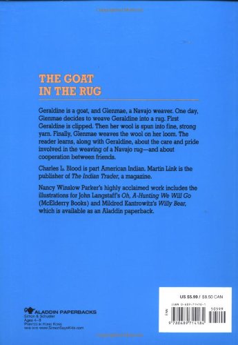 Geraldine is a goat, and Glenmae, a Navajo weaver. One day, Glenmae decides to weave Geraldine into a rug. First Geraldine is clipped. Then her wool is spun into fine, strong yarn. Finally, Glenmae weaves the wool on her loom. They reader learns, along with Geraldine, about the care and pride involved in the weaving of a Navajo rug — and about cooperation between friends.