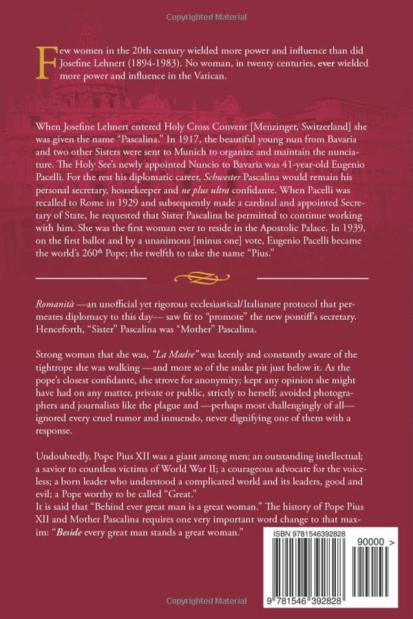 Few women in the 20th century wielded more power and influence than did Josefine Lehnert (1894-1983). No woman, in twenty centuries, ever wielded more power and influence in the Vatican.When Josefine Lehnert entered Holy Cross Convent [Menzinger, Switzerland] she was given the name “Pascalina.” In 1917, the beautiful young nun from Bavaria and two other Sisters were sent to Munich to organize and maintain the nunciature. The Holy See’s newly appointed Nuncio to Bavaria was 41-year-old Eugenio Pacelli. For the rest his diplomatic career, Schwester Pascalina would remain his personal secretary, housekeeper and ne plus ultra confidante. When Pacelli was recalled to Rome in 1929 and subsequently made a cardinal and appointed Secretary of State, he requested that Sister Pascalina be permitted to continue working with him. She was the first woman ever to reside in the Apostolic Palace. In 1939, on the first ballot and by a unanimous [minus one] vote, Eugenio Pacelli became the world’s 260th Pope; the twelfth to take the name “Pius.”Romanita –an unofficial yet rigorous ecclesiastical/Italianate protocol that permeates diplomacy to this day– saw fit to “promote” the new pontiff’s secretary. Henceforth, “Sister” Pascalina was “Mother” Pascalina. Strong woman that she was, “La Madre” was keenly and constantly aware of the tightrope she was walking –and more so of the snake pit just below it. As the pope’s closest confidante, she strove for anonymity; kept any opinion she might have had on any matter, private or public, strictly to herself; avoided photographers and journalists like the plague and –perhaps most challengingly of all– ignored every cruel rumor and innuendo, never dignifying one of them with a response.Undoubtedly, Pope Pius XII was a giant among men; an outstanding intellectual; a savior to countless victims of World War II; a courageous advocate for the voiceless; a born leader who understood a complicated world and its leaders, good and evil; a Pope worthy to be called “Great”.It is said that “Behind ever great man is a great woman.” The history of Pope Pius XII and Mother Pascalina requires one very important word change to that maxim: “Beside every great man stands a great woman.”