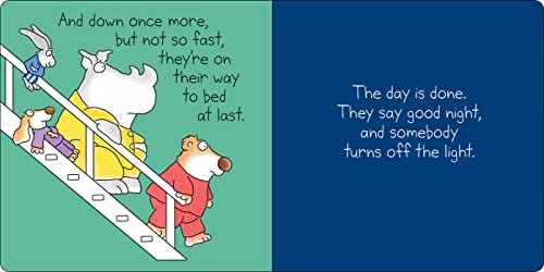 Getting ready for sleep is tons of fun in this iconic board book from author and illustrator Sandra Boynton–now available in an oversized lap edition! This classic bedtime story is just right for winding down the day as a joyful, silly group of animals scrub scrub scrub in the tub, brush and brush and brush their teeth, and finally rock and rock and rock to sleep. It’s BIG fun from Sandra Boynton in the big, big size of this favorite board book. The day is done. They say good night, and somebody turns off the light.