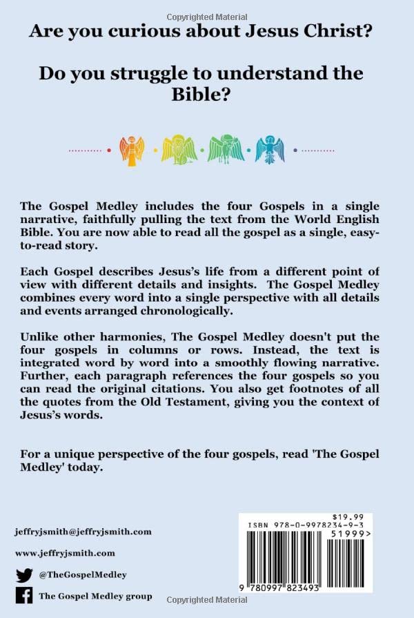 Are you curious about Jesus Christ? Do you struggle to understand the Bible? The Gospel Medley includes the four Gospels in a single narrative, faithfully pulling the text from the World English Bible. You are now able to read all the gospel as a single, easy-to-read story. Each Gospel describes Jesus’s life from a different point of view with different details and insights. The Gospel Medley combines every word into a single perspective with all details and events arranged chronologically. Unlike other harmonies, The Gospel Medley doesn’t put the four gospels in columns or rows. Instead, the text is integrated word by word into a smoothly flowing narrative. Further, each paragraph references the four gospels so you can read the original citations. You also get footnotes of all the quotes from the Old Testament, giving you the context of Jesus’s words. For a unique perspective of the four gospels, read ‘The Gospel Medley’ today.