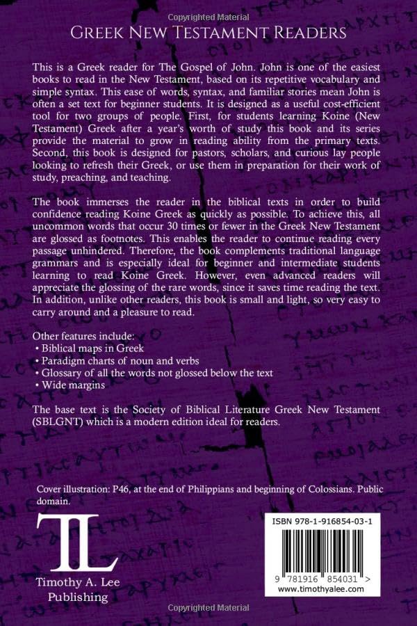 This is a Greek reader for The Gospel of John. John is one of the easiest books to read in the New Testament, based on its repetitive vocabulary and simple syntax. This ease of words, syntax, and familiar stories mean John is often a set text for beginner students. It is designed as a useful cost-efficient tool for two groups of people. First, for students learning Koine (New Testament) Greek after a year’s worth of study this book and its series provide the material to grow in reading ability from the primary texts. Second, this book is designed for pastors, scholars, and curious lay people looking to refresh their Greek, or use them in preparation for their work of study, preaching, and teaching. The book immerses the reader in the biblical texts in order to build confidence reading Koine Greek as quickly as possible. To achieve this, all uncommon words that occur 30 times or fewer in the Greek New Testament are glossed as footnotes. This enables the reader to continue reading every passage unhindered. Therefore, the book complements traditional language grammars and is especially ideal for beginner and intermediate students learning to read Koine Greek. However, even advanced readers will appreciate the glossing of the rare words, since it saves time reading the text. In addition, unlike other readers, this book is small and light, so very easy to carry around and a pleasure to read. Other features include: Biblical maps in Greek Paradigm charts of noun and verbs Glossary of all the words not glossed below the text Wide margins The base text is the Society of Biblical Literature Greek New Testament (SBLGNT) which is a modern edition ideal for readers.