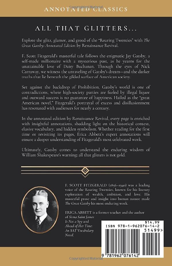 Explore the glitz, glamor, and greed of the “Roaring Twenties” with the annotated edition of The Great Gatsby by Renaissance Revival. F. Scott Fitzgerald’s masterful tale follows the enigmatic Jay Gatsby, a self-made millionaire with a mysterious past, as he yearns for the unattainable love of Daisy Buchanan. Through the eyes of Nick Carraway, we witness the unraveling of Gatsby’s dream–and the darker truths that lie beneath the gilded surface of American society. Set against the backdrop of Prohibition, Gatsby’s world is one of contradictions, where high-society parties are fueled by illegal liquor and outward success is no guarantee of happiness. Hailed as the “great American novel,” Fitzgerald’s portrayal of excess and disillusionment has resonated with audiences for nearly a century. In the annotated edition by Renaissance Revival, every page is enriched with insightful annotations, shedding light on the historical context, elusive vocabulary, and hidden symbolism. Whether reading for the first time or revisiting its pages, Erica Abbett’s expert annotations will ensure a deeper understanding of Fitzgerald’s most celebrated work. Unlock the Jazz Age: The Annotated Edition of The Great Gatsby Over 400 Insightful Annotations: Discover the hidden layers of The Great Gatsby with Erica Abbett’s expert commentary, designed to illuminate complex language, historical references, and symbolic nuance. Glossary of Terms: Easily reference key terms and phrases with a comprehensive glossary at the back of the book, making F. Scott Fitzgerald’s masterpiece more approachable than ever. Witty Foreword and Afterword: Begin and end your journey with Erica Abbett’s lively insights, offering historical context and thoughtful reflections you’ll actually enjoy reading. Perfect for Students and Enthusiasts: Whether you’re encountering Gatsby for the first time or revisiting it as a seasoned reader, this edition bridges the gap between past and present with clarity and charm. Crafted by an Expert Educator: Erica Abbett, a former English and history teacher, brings her years of classroom expertise to help readers fully appreciate the richness of Fitzgerald’s prose.