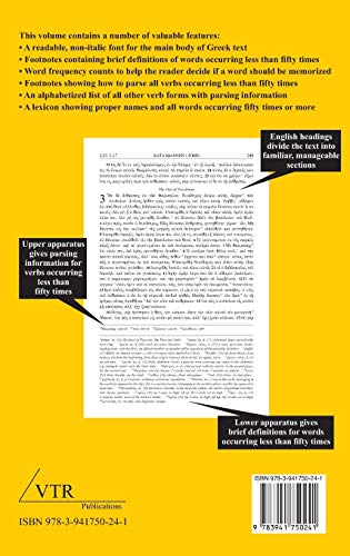 “The Greek New Testament for Beginning Readers” contains a number of valuable features: – A readable, non-italic font for the main body of Greek text – Footnotes containing brief definitions of words occurring less than fifty times – Word frequency counts to help the reader decide if a word should be memorized – Footnotes showing how to parse all verbs occurring less than fifty times – An alphabetized list of all other verb forms with parsing information – A lexicon showing proper names and all words occurring fifty times or more