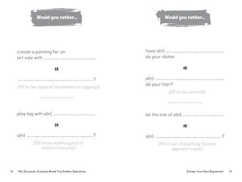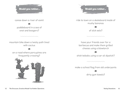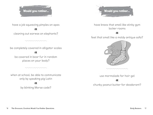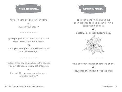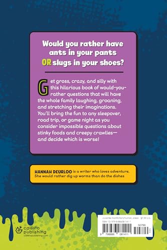 WOULD YOU RATHER…. Have ants in your pants OR slugs in your shoes? Use a toilet seat made of pinecones OR toilet paper made of bologna? Get gross, crazy, and silly with this hilarious book of would-you-rather questions that will have the whole family laughing, groaning, and stretching their imaginations. And bring the fun to any sleepover, road trip, or game night as you consider impossible questions about stinky foods and creepy crawlies and decide which is worse! Tons of fun–Find 160 outrageous questions that are just the right level of gross and funny to delight kids ages 6 to 9. Write your own–Take a crack at crafting your own wacky questions with fill-in-the-blank options at the back of the book. On the go–This compact (and screen-free!) book is easy to pull out and pass around at a backyard BBQ, a beach vacation, or anywhere you are! Get The Grossest, Craziest Would You Rather Questions and find out once and for all if you’d rather take a bath in a tub full of tadpoles OR shower with an octopus. Your answer might surprise you.