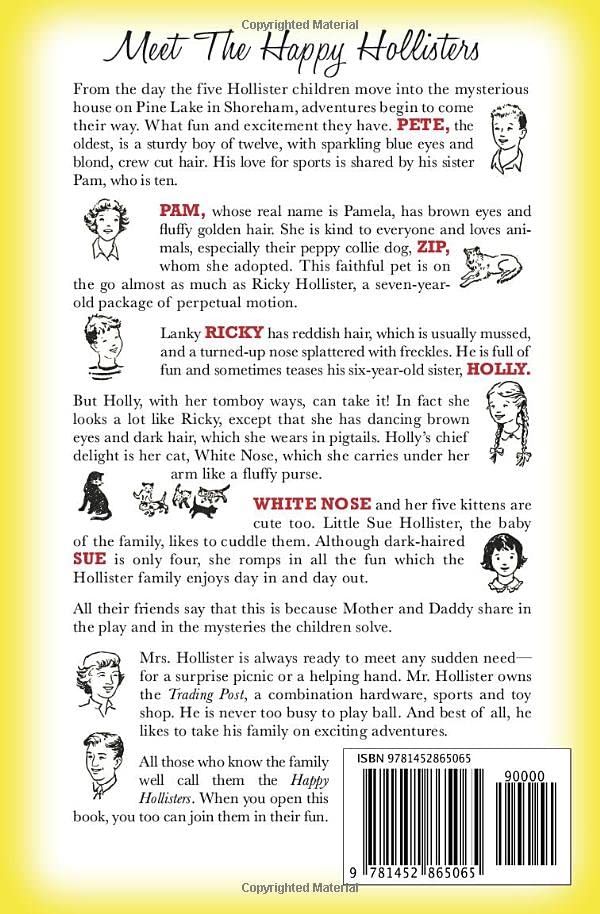 The Happy Hollisters: America’s Favorite Classic Mystery Series for Young Readers The Happy Hollisters was the best-selling mystery/adventure series for children aged 6-12 in the 1950s and 60s with over 16 million copies sold. The complete 33-book series has now been reissued in paperback format for the very first time. The books are clean, wholesome, cheerful, and exciting action-packed mysteries for boys and girls. The Happy Hollisters, volume 1, has more than 600 five-star ratings on Amazon and more than 2,000 5-star ratings on Goodreads! “. . . the love between family members, the resourcefulness, the eagerness to find the answers to the problems . . . all make for a fun and positive read.”~Julie, Goodreads “If you like cliffhangers, adventures, history, mystery, and geography, these books are for you.”~Charlie, 9-year-old fan “A great throwback children’s mystery with lively characters and old-fashioned charm. I really enjoyed this whimsical read.”~Scott P., Goodreads This classic, family-oriented 33-book series has been faithfully reissued in paperback, hardcover, eBook, and audiobook formats by the author’s family for a new generation of young readers, with a timeless accent on humor and good, clean fun. Integrity always pays off, and right wins over wrong. Parents, grandparents, and teachers love these books for their celebration of life in simpler times and family discussions that may ensue. Kids love the fast-paced action and will not want to put them down. This is a perfect gift for the young reader in your life! Volume 1: The adventures for the Hollisters begin as soon as they move into their new house on the shore on Pine Lake in Shoreham. First, the moving van carrying their toys and their father’s important new invention disappears. Next, they learn that their house may be haunted, with a treasure hidden somewhere inside! Right away they all set out to solve these mysteries. Each one of the Hollister children – Pete (age 12), Pam (10), Ricky (7), Holly (6) and Sue (4) – plays an important role in finding clues, along with their parents, who are always ready to join in on the excitement. Even Zip, the collie, and White Nose, the cat, are part of the family and find thrilling adventures of their own. As the Hollisters explore their new town and make friends, they discover what happened to the moving van and learn more about the mystery surrounding their new home. Excitement abounds when a secret stairway is discovered. Then, on the trail of a mysterious intruder, their chase leads them to a deserted hut on nearby Blackberry Island. For more information about the books, please visit official site, TheHappyHollisters dotcom