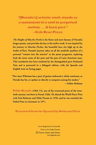 Pablo Neruda’s most famous long poem, with the English translations and original Spanish presented side by side. The Heights of Macchu Picchu is the finest and most famous of Neruda’s longer poems and provides the key to his earlier work. It was inspired by his journey to Macchu Picchu, the Peruvian Inca city high in the Andes. Neruda’s journey takes on all the symbolic qualities of a personal “venture into the interior” as the poem progresses, exploring both the roots of the poet’s identity and the history of Latin America. This translation has been rendered by the distinguished poet Nathaniel Tarn and is presented in a bilingual edition, with the Spanish and English texts on facing pages.